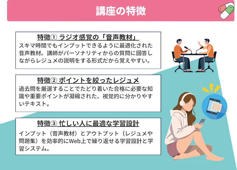 はじめて学ぶ方でも安心して取り組める、わかりやすさにこだわったオンライン講座です。重要ポイントを押さえたカリキュラムで、効率よく合格を目指せます。